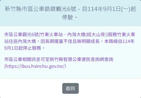 停駛路線 觀光6號 竹東火車站—內灣大橋(經大山背)