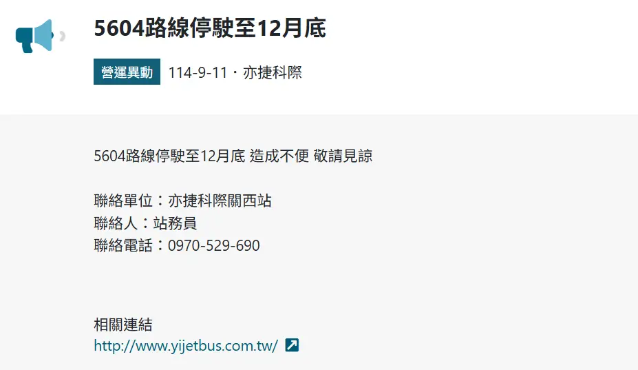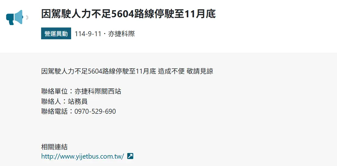 因駕駛人力不足5604路線停駛至11月底,造成不便,敬請見諒。