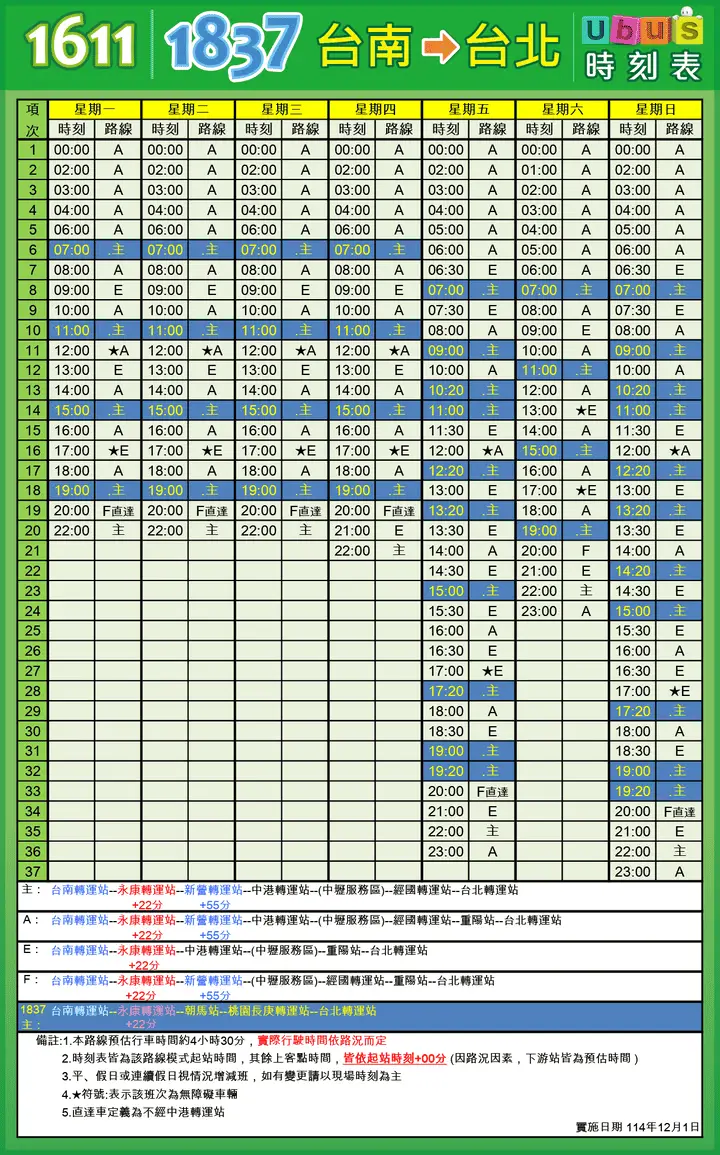 12 00 1611A 永康 新營 中港 經國 重陽 臺北 1234567