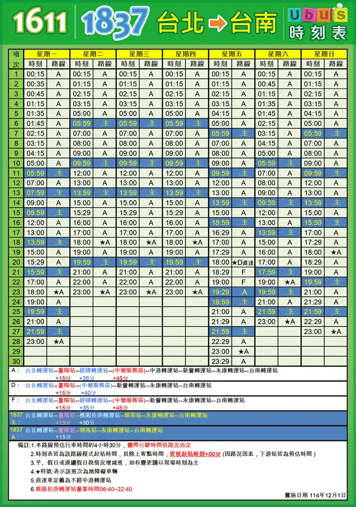 16 00 1611A 永康 新營 中港 經國 重陽 臺北 1234567