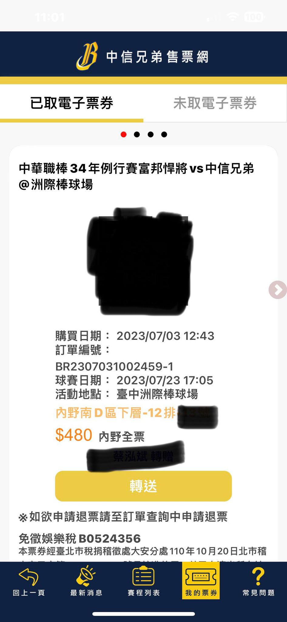 票券日期:7/23(日)富邦vs兄弟 洲際球場