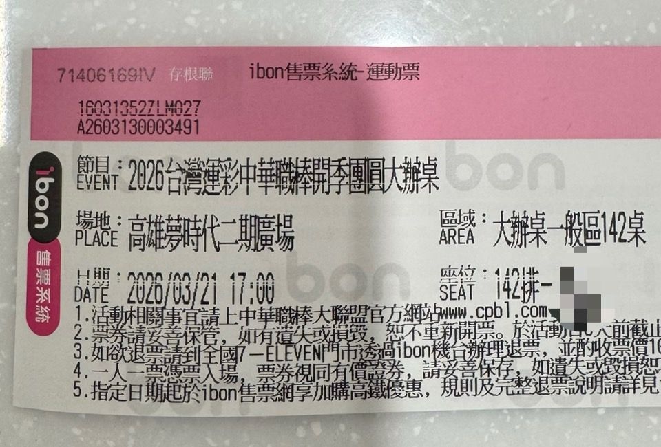 ※ 文章網址: https://webptt.com/m.aspx?n=bbs/CPBL_ticket/M.1773922830.A.922.html