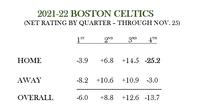 賽爾提克這季在第二節和第三節的平均勝分是正的,但第一節和第四節是負的