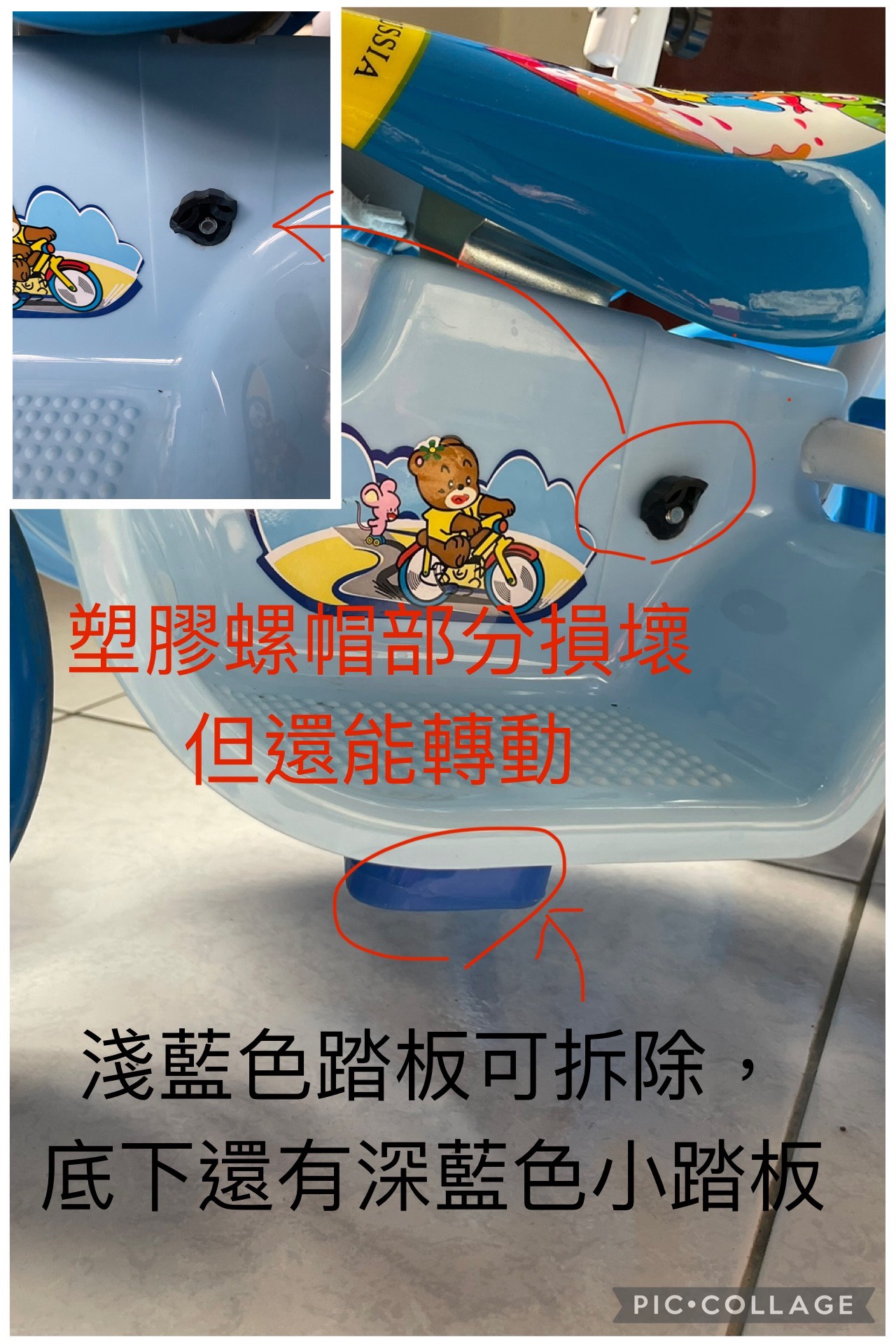 座椅下方踏板的後塑膠螺帽有破損,但還能以手轉動拆除,其餘功能皆正常。