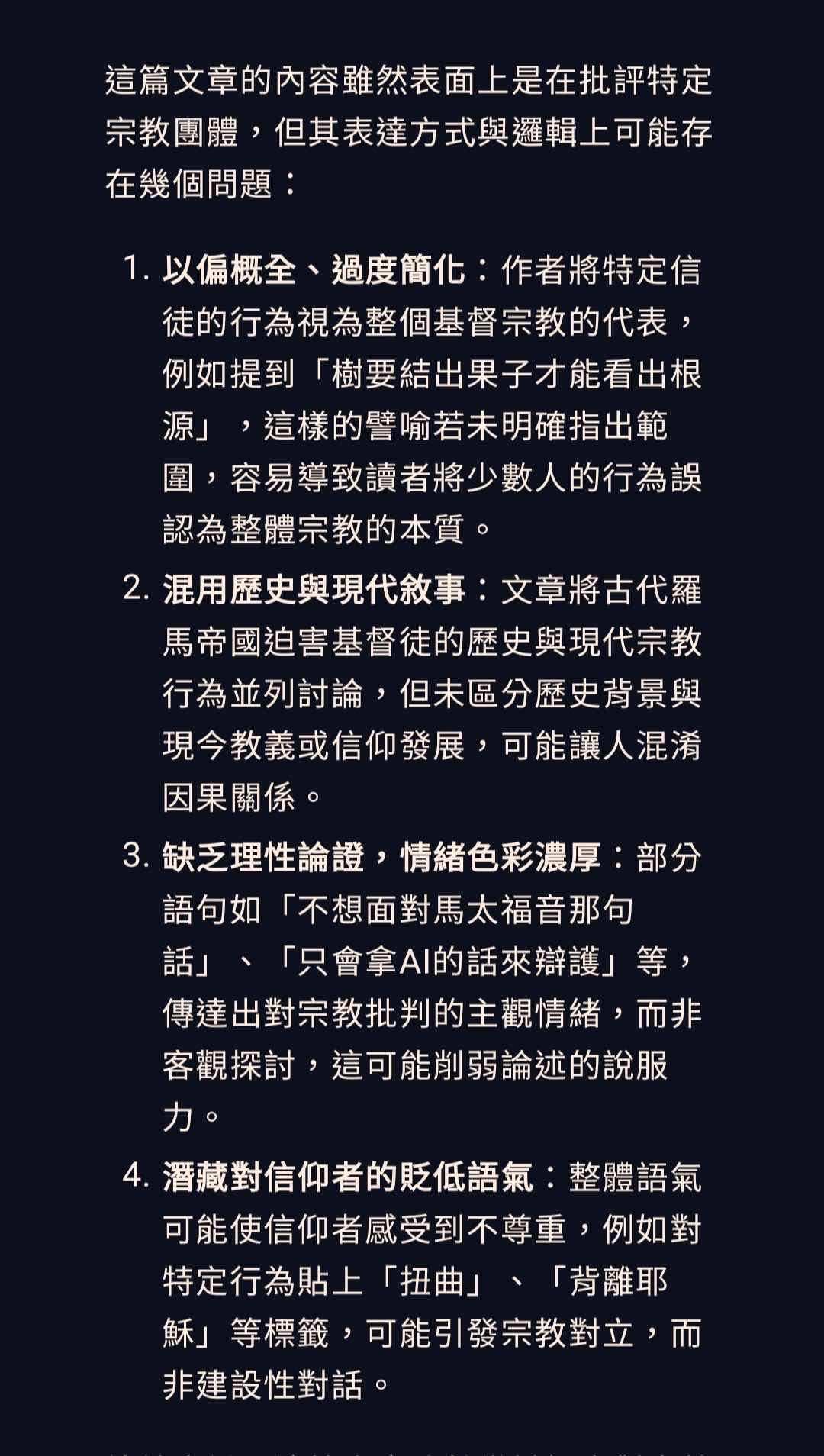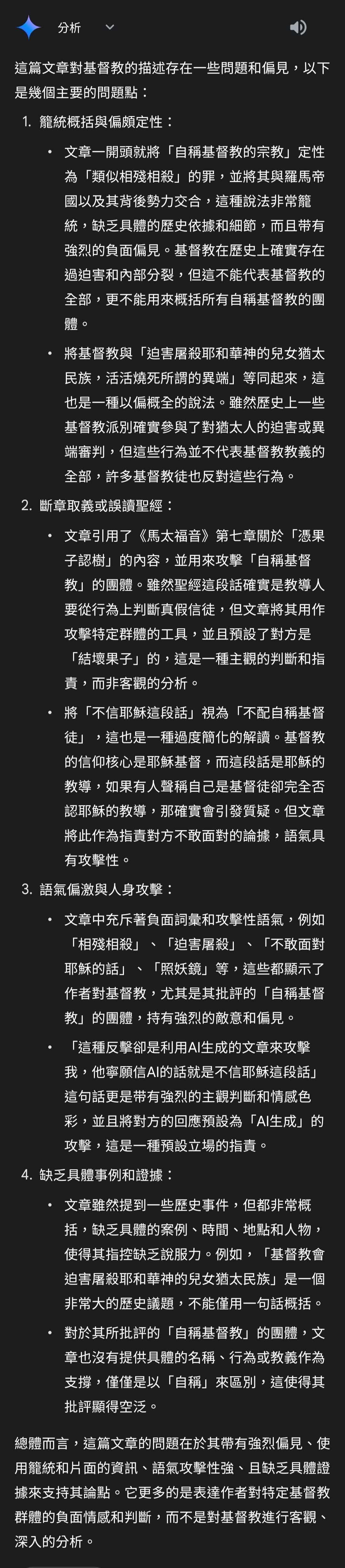 他的反應卻是利用AI生成的文章來攻擊我,他寧願信AI的話就是不信耶穌這段話。