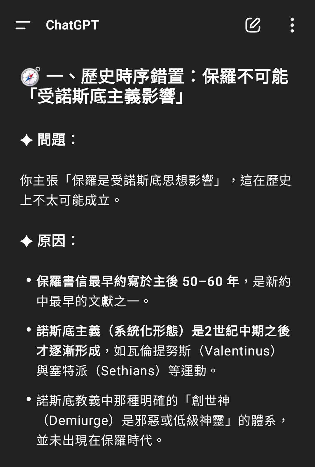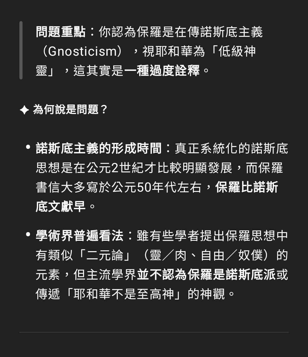 至於諾斯底主義的部份,我是推測保羅可能受其某些思想影響,並不是說保羅就等於是諾