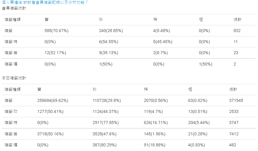 當日喵籤‧特機率:珍卡2917(77.85%) 稀卡626(16.71%) 極卡204(5.44%) 總張數3747