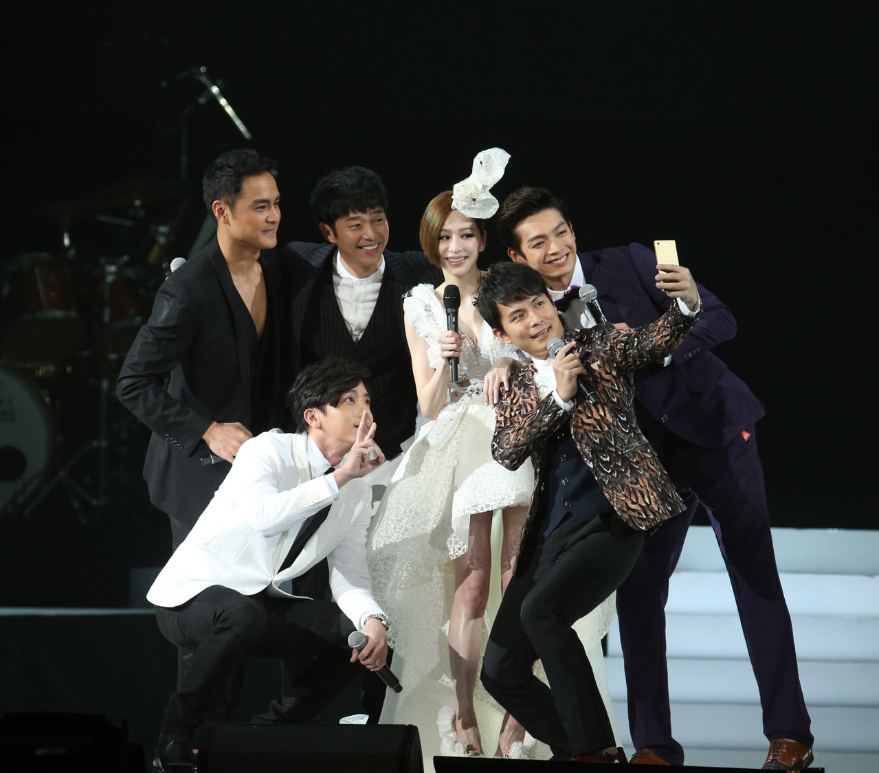 辰亦儒(右起)、王心凌、張棟樑、明道及坤達在台上玩自拍。翻攝孫協志臉書