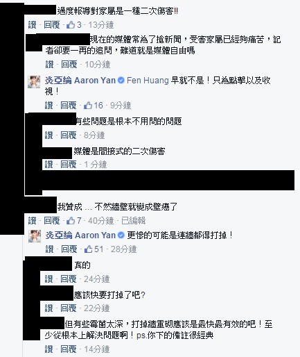 有網友對於近期媒體不斷重複報導內湖女頭命案的相關細節相當不滿,在網路上發起連署要求NCC介入管理,炎亞綸今天在臉書轉貼該連署的連結,有感而發表示:「一面發霉的牆,如果我們只不斷的刮除表面的霉,而不深入牆內把霉菌連根拔除,那這面牆上的霉只會越長越多越長越密。」引起不少粉絲回應,表示對於近期媒體事件無限擴大的報導感到厭煩,但其實觀眾也要有判斷的能力,炎亞綸則回覆該名網友「我們自己也要改變」。