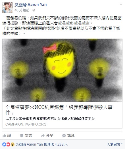 藝人炎亞綸今天在臉書上要大家支持「全民連署要求NCC約束媒體『過度報導隨機殺人事件』」並批評電子媒體不懂重點、不會下標。他還比喻說:「一面發霉的牆,如果我們只不斷的刮除表面的霉而不深入牆內把霉菌連根拔除,那這面牆上的霉只會越長越多越長越密。(此文重點在解決問題的根源,給看不懂重點以及不會下標的電子媒體的提醒)。」(蔡敦仰/綜合報導)