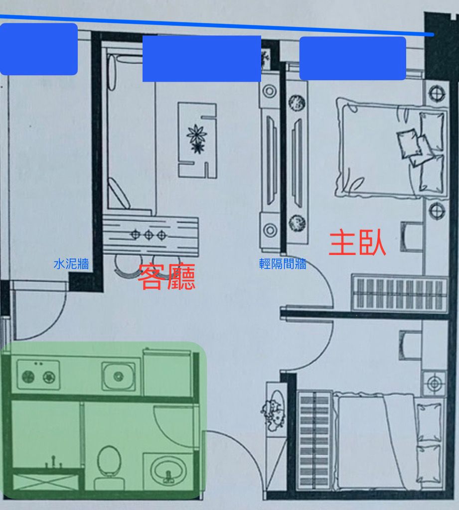 藍方塊是冷氣安裝位置,圖左藍方塊是冷氣室外機在陽台。