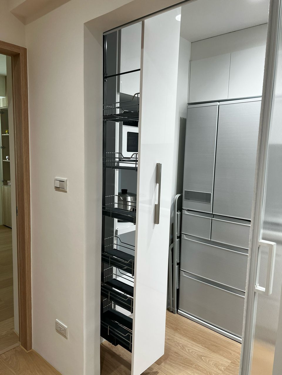 深度、寬度、分層都配合我們會買的食材。用一年後覺得是廚房最值得投資的部分,然後