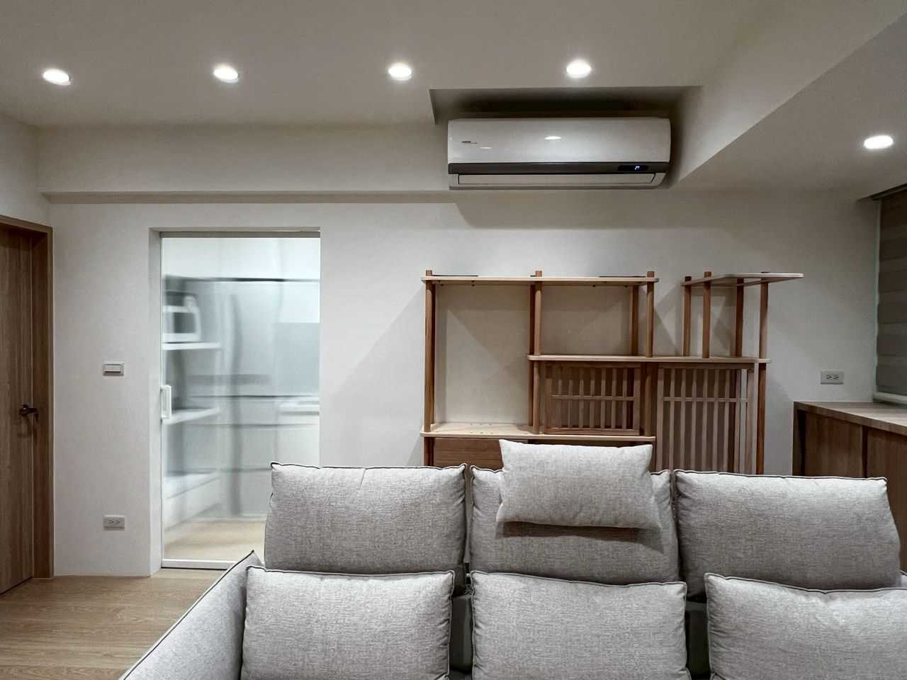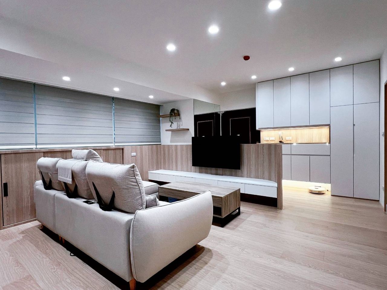 老屋樑很多,如果做亮面系統櫃會很廉價。噴漆質感真的差很多,視覺乾淨又舒服。