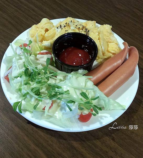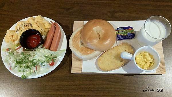 價格來說還算合理 一份沙拉加炒蛋以及德國香腸,還有薯餅與貝果 圖片: