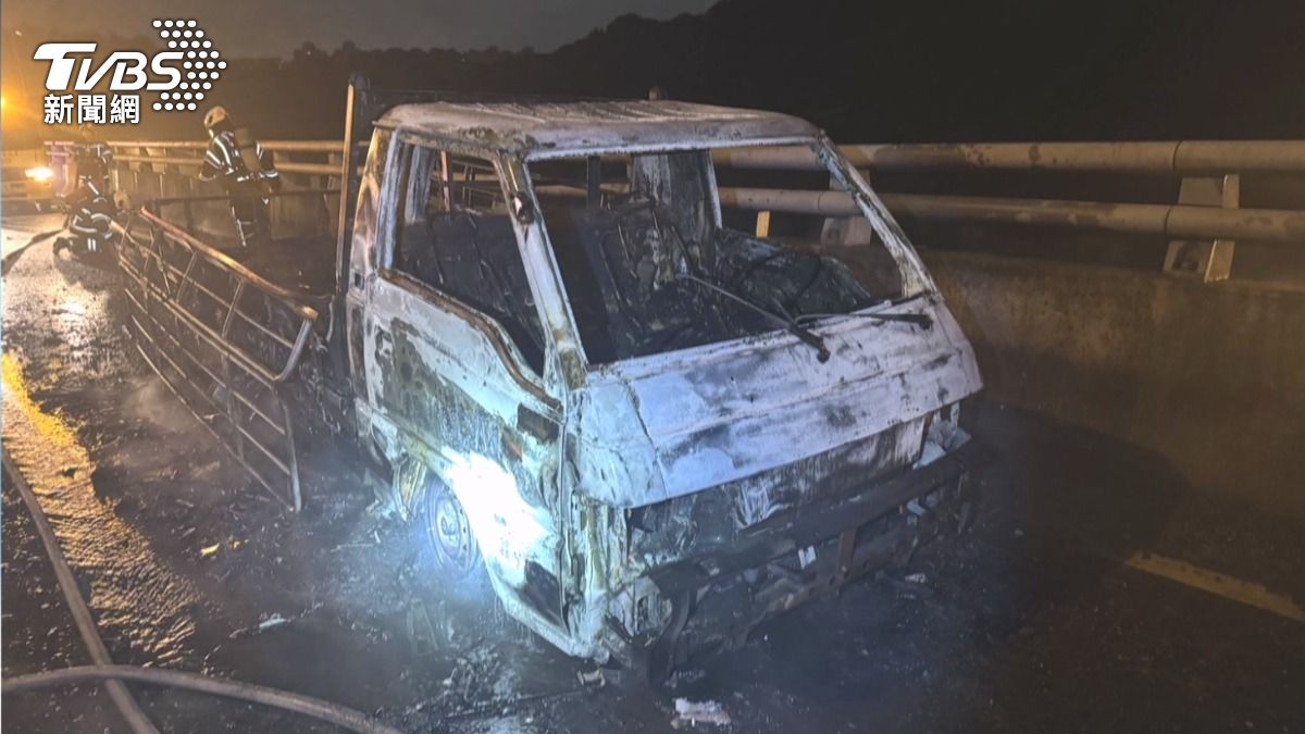 這起事故沒有造成任何人員傷亡,但小貨車已經被火舌吞噬,只剩下車架。(圖/TVBS)