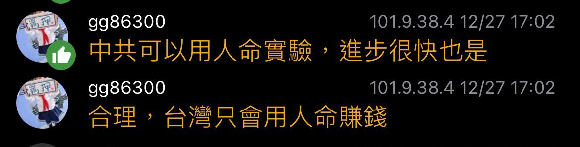 724F:推 gg86300: 中共可以用人命實驗,進步很快也是 101.9.38.4 12/27 17:02