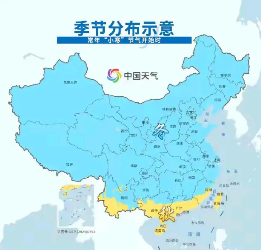 看圖,全國(含淪陷未統一區域),只剩台灣、兩廣、海南跟部分福建雲南還在秋天。