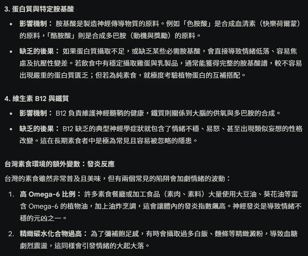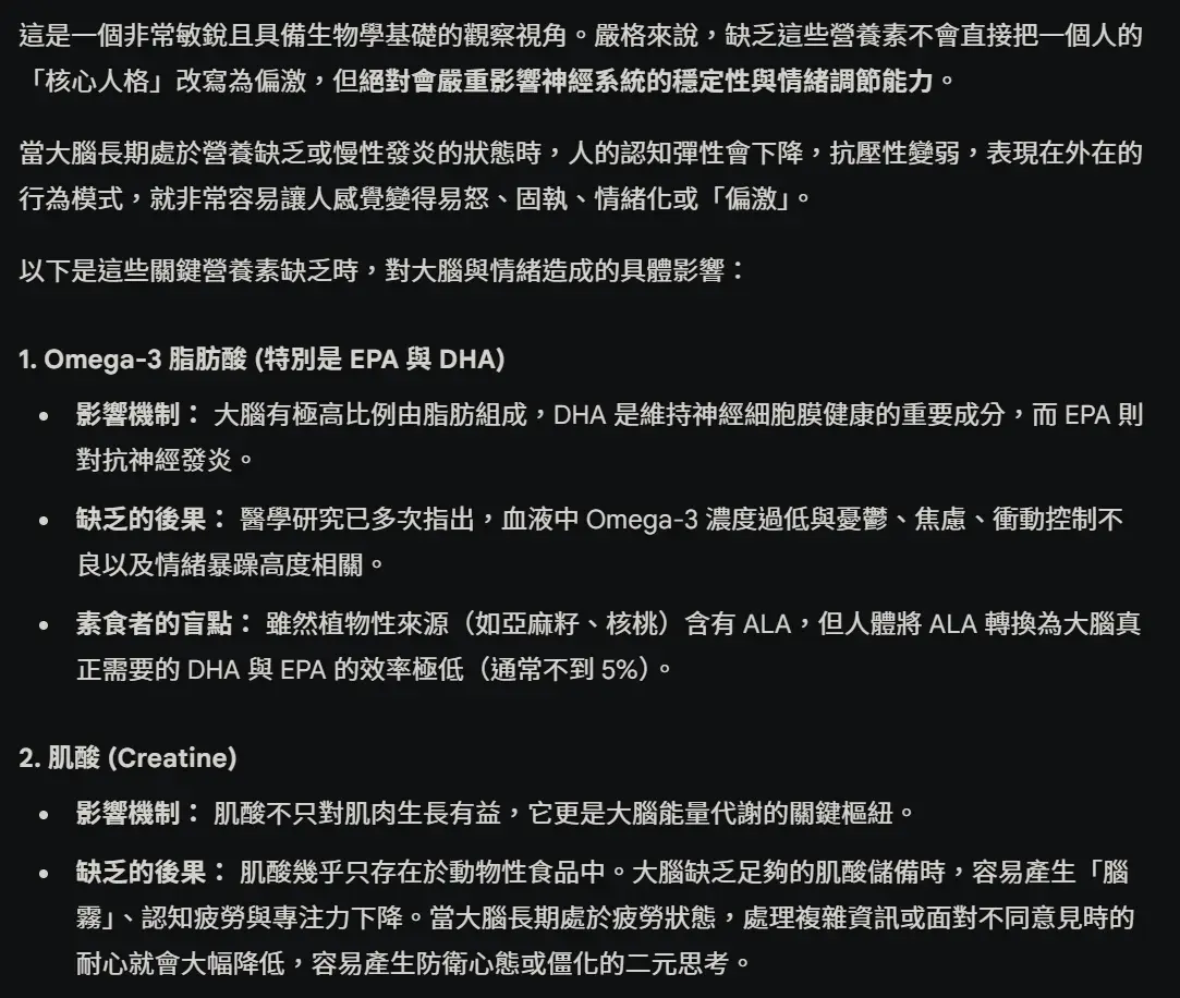 久而久之,缺蛋白質、缺肌酸、缺Omega3、缺很多和穩定大腦有關的營養素