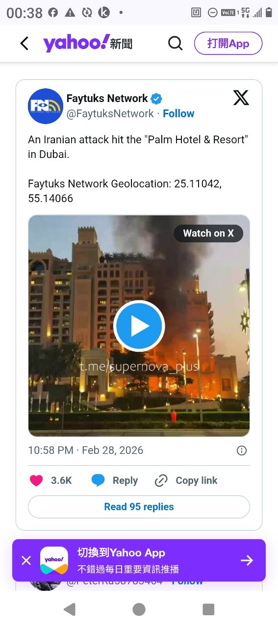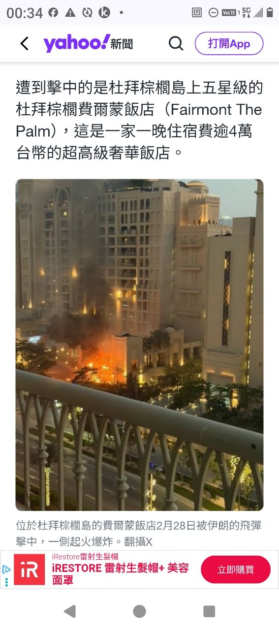 剛看到杜拜朱美拉棕櫚島豪華飯店遭伊朗無人機擊中 傷亡不明