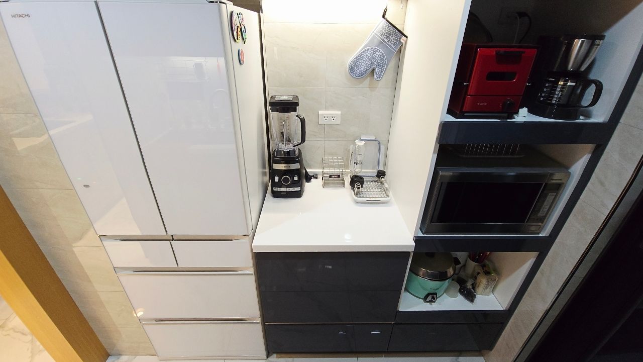 轉個身,由左至右依序是,雙開門冰箱、料理檯面、電器櫃,