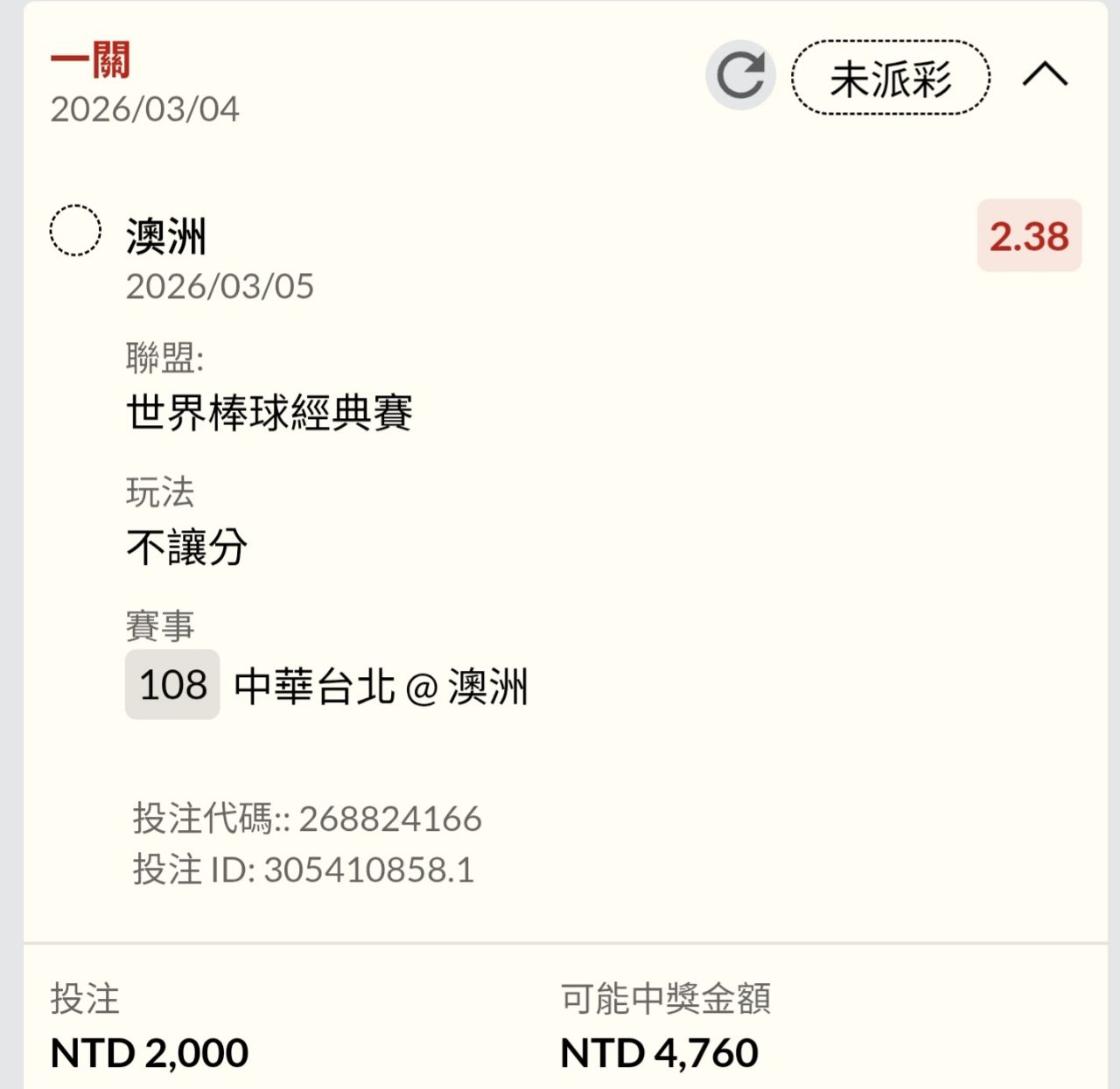 2026年WBC世界棒球經典賽今天開打,首戰將由台灣對上澳洲,台灣運彩賠率顯示台灣贏球
