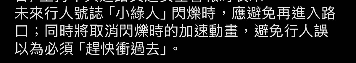 未來行人號誌「小綠人」閃爍時,應避免再進入路口;同時將取消閃爍時的加速動畫,避