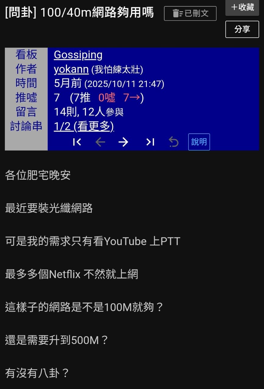 去年10/11發了一篇問“100/40M網路夠用嗎”