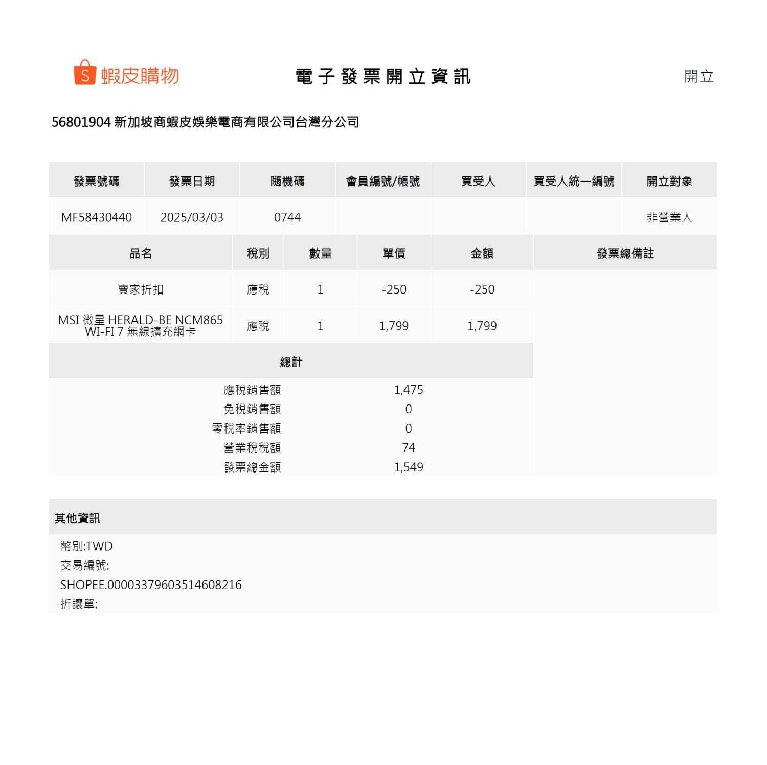 ◎硬體型號: 微星 HERALD-BE NCM865 WI-FI 7 無線擴充網卡