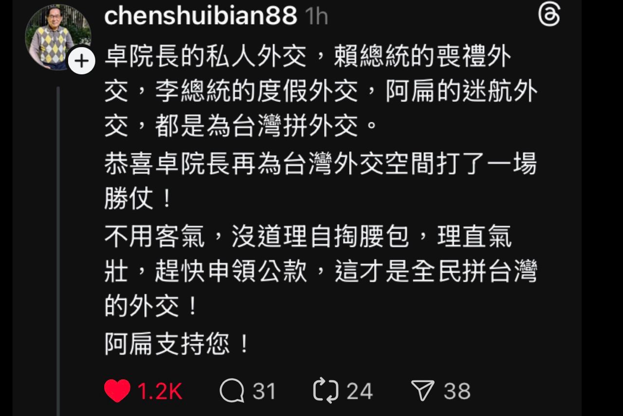 卓院長的私人外交,賴總統的喪禮外交,李總統的度假外交,阿扁的迷航外交,都是為台