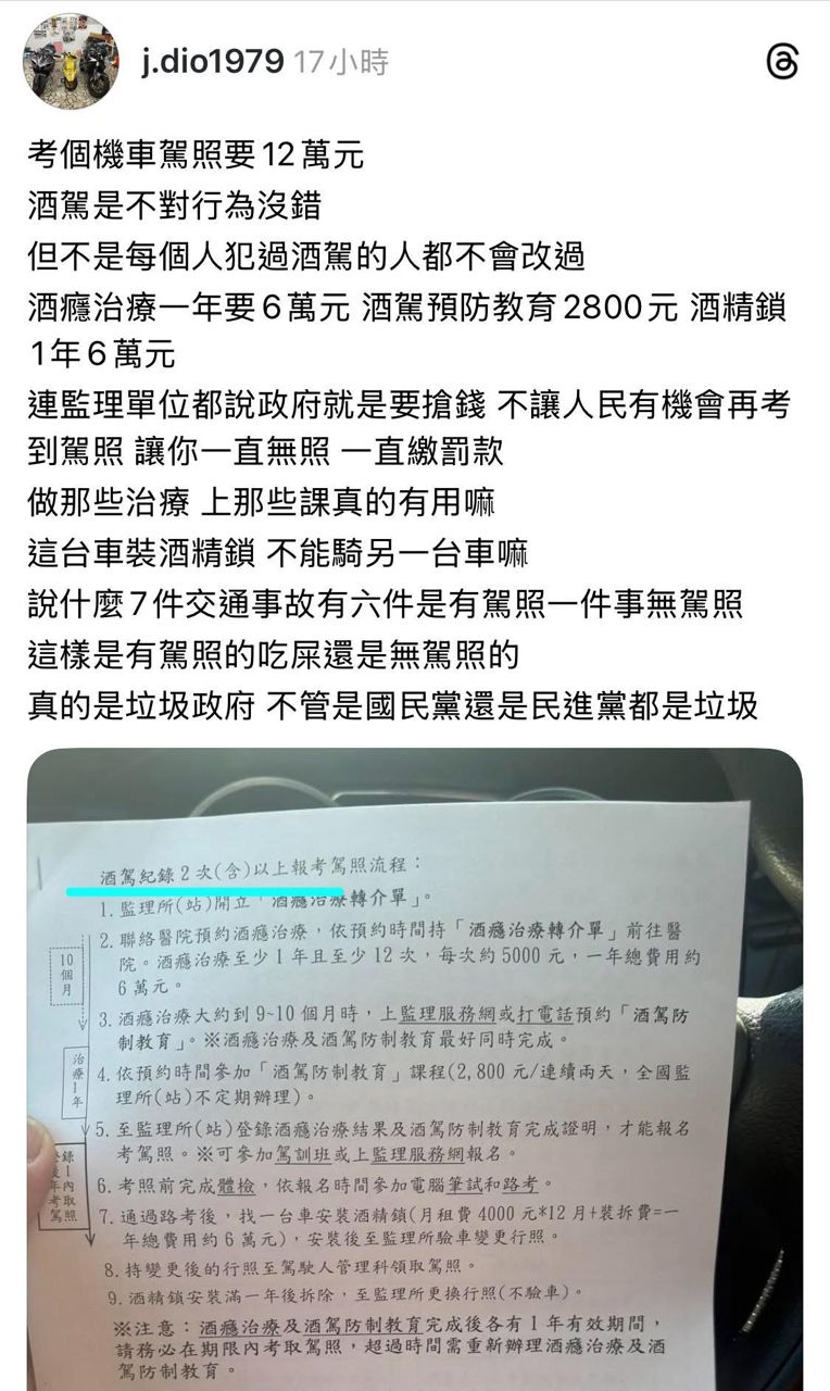 : 「考個機車駕照要12萬元 酒駕是不對行為沒錯 但不是每個人犯過酒駕的人都不會改過