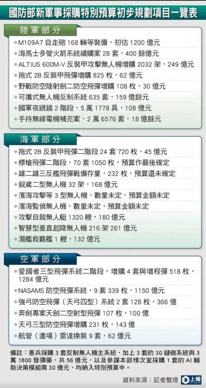 今天你民進黨說要1.25兆買武器,然後給了一份清單,上面有各種飛機,飛彈