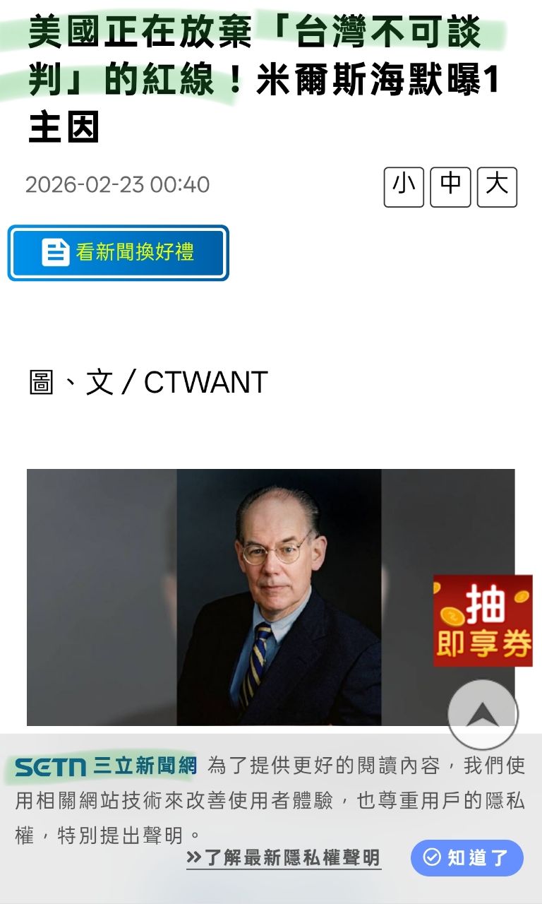 三立新聞報導美國專家-國際政治學大師米爾斯海默表示:美國正在放棄台灣不可談判的