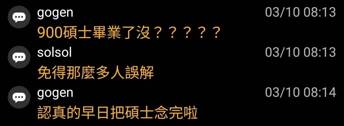 42F:→ dayuer: ,結果gogen還能噴人碩士要念完,這邏輯114.136.202.100 03/10 08:49