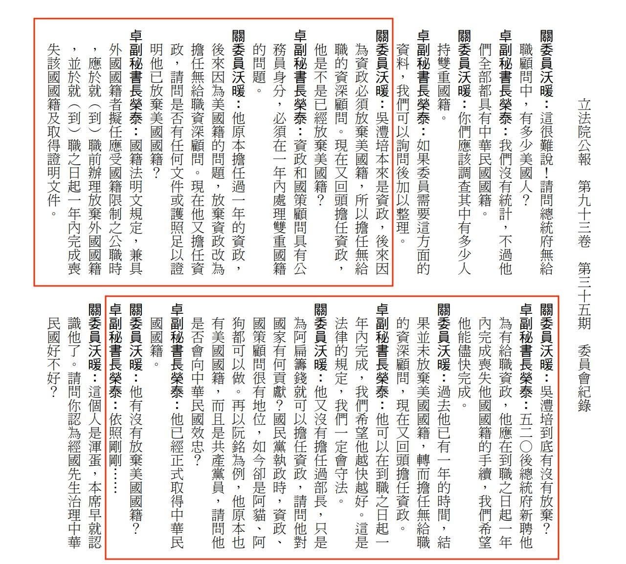 卓副秘書長榮泰:國籍法明文規定,兼具外國國籍者擬任應受國籍限制之公職時,應於就