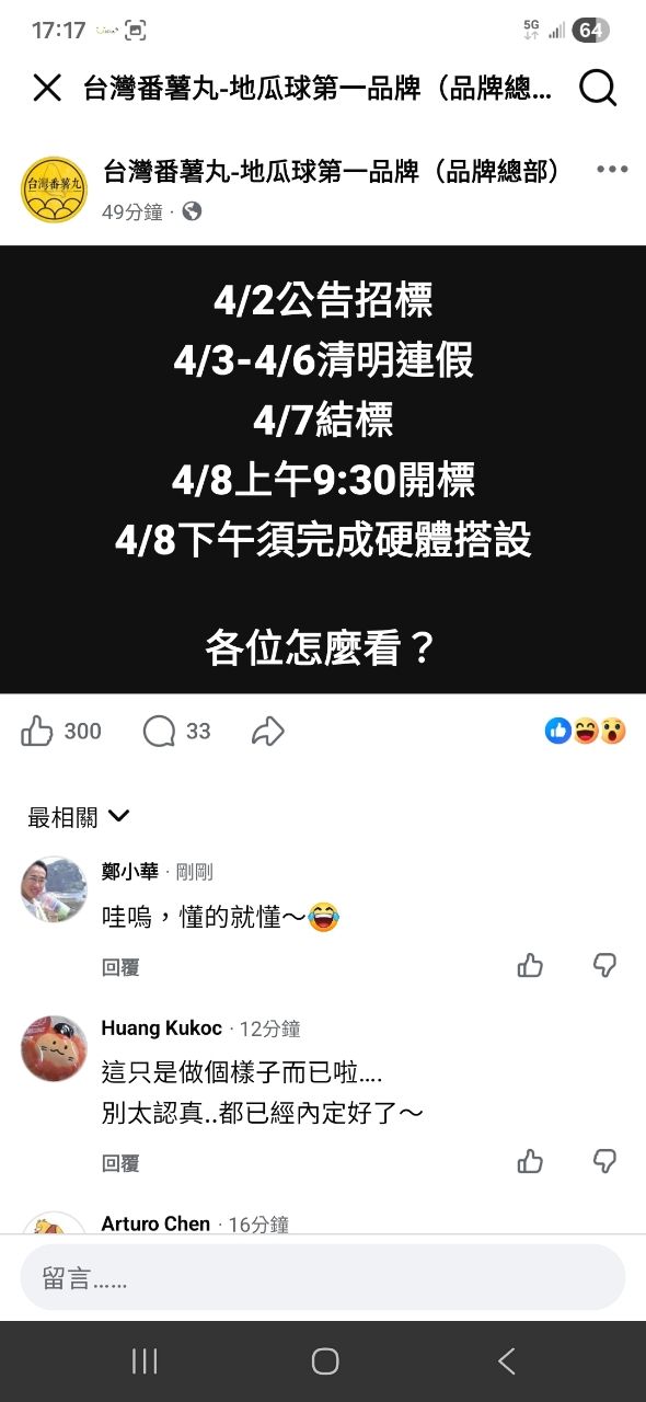 然後又依據台灣蕃薯丸(獅隊合作店家)粉專資訊,體育局4/8早上開標,下午就要完成