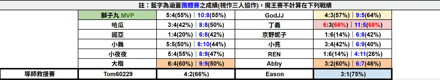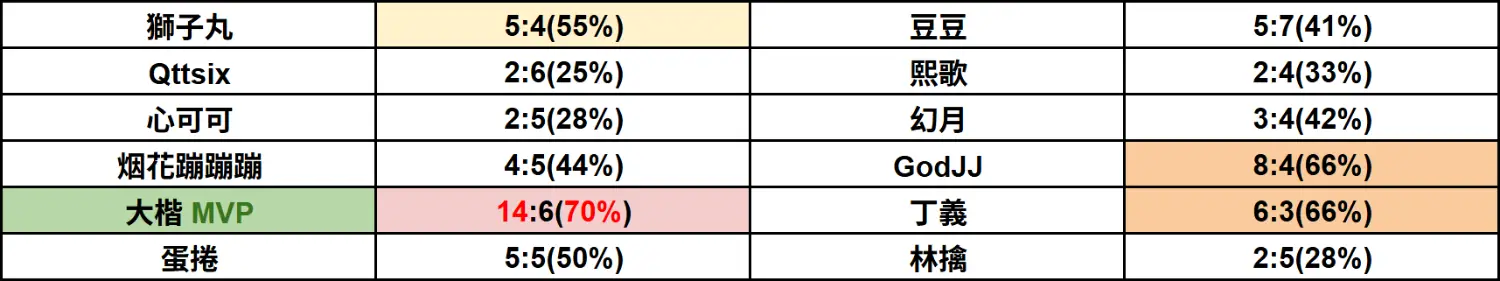 排序僅是筆者個人欲呈現的模式,旨在兼顧場數(由上到下)與勝率(顏色區分)。
