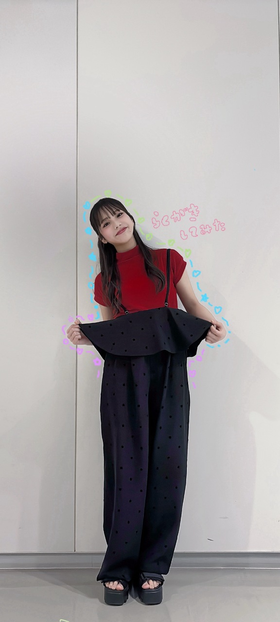 赤のハイネックにドット柄のフリルオールインワン合わせてみたんだ~
