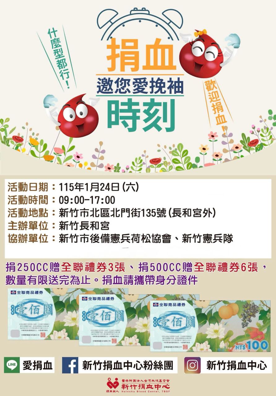 標題[捐血] 1/24新竹市長和宮捐血送全聯禮券