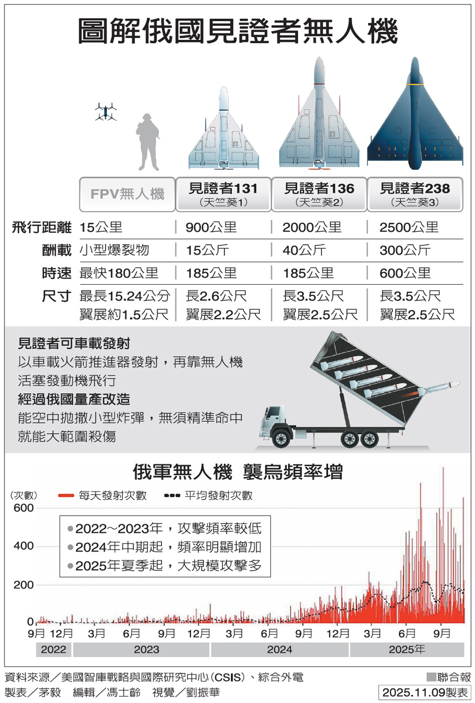 烏克蘭國防部情報總局說,俄國正邁向每月生產逾六千架「見證者」類型無人機的目標。