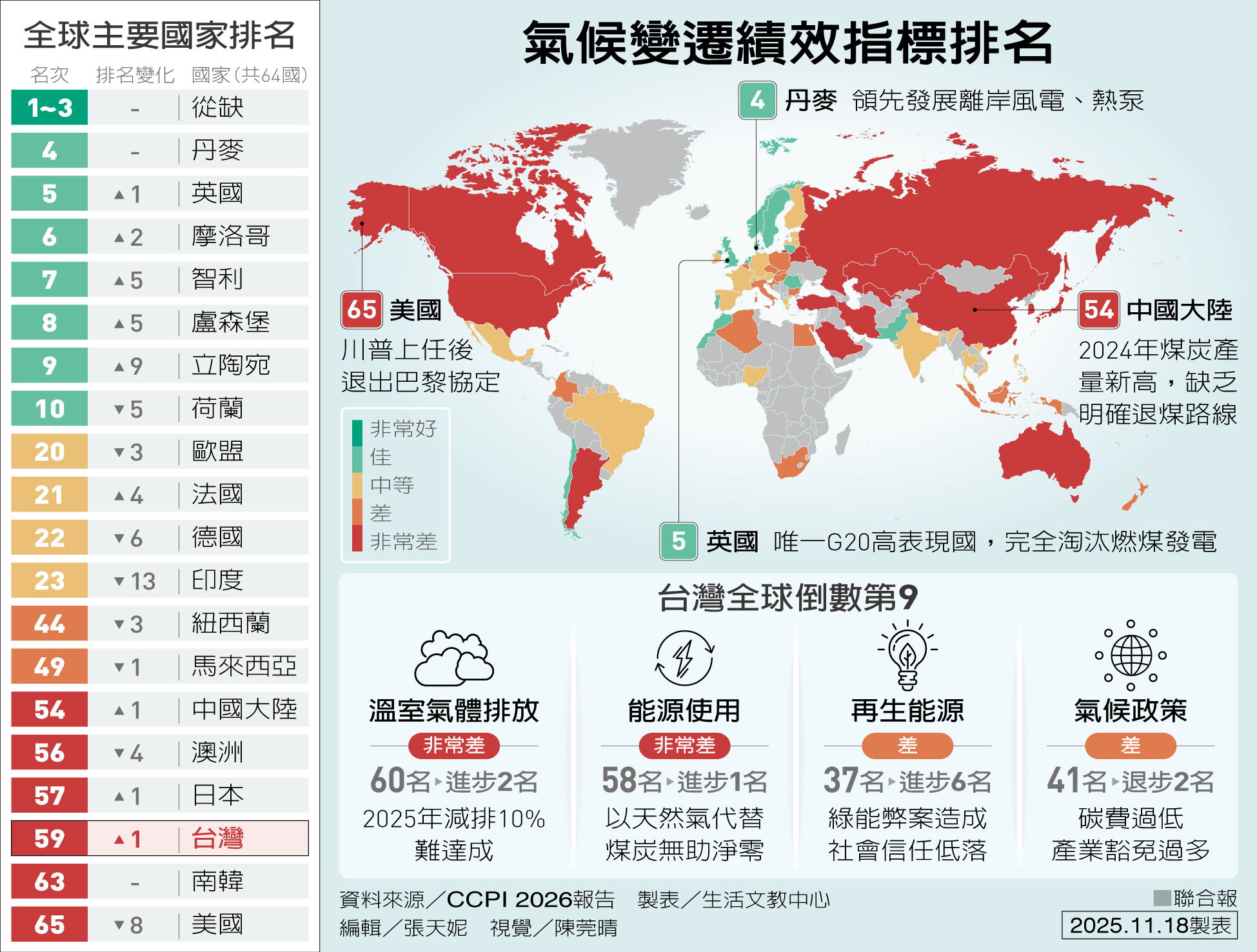 發布全球「氣候變遷績效指標」(CCPI)二○二六版,台灣從去年六十名,微幅進步到五
