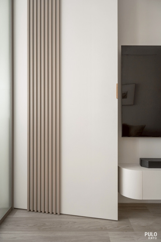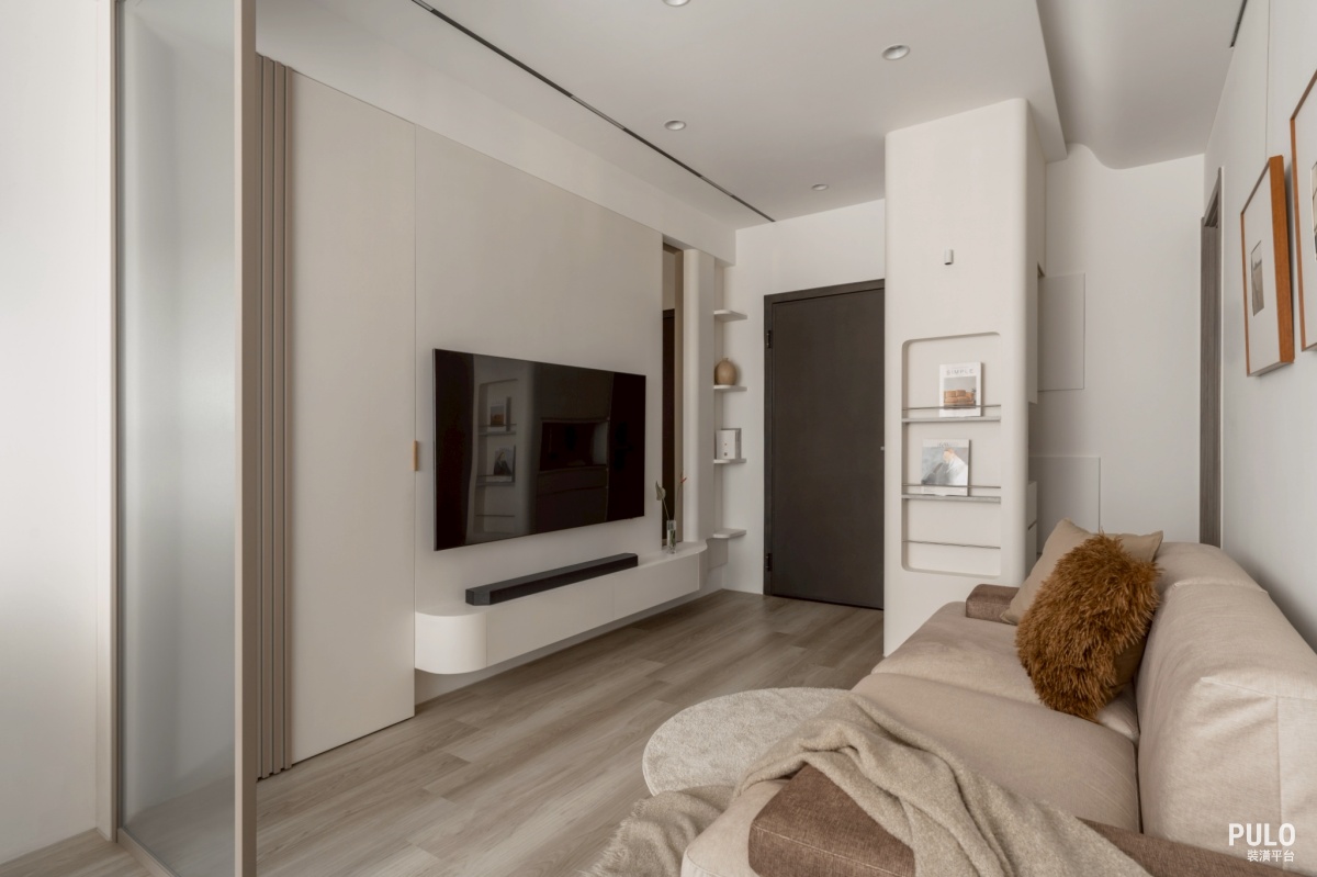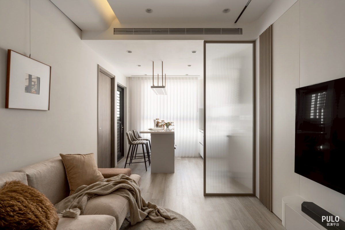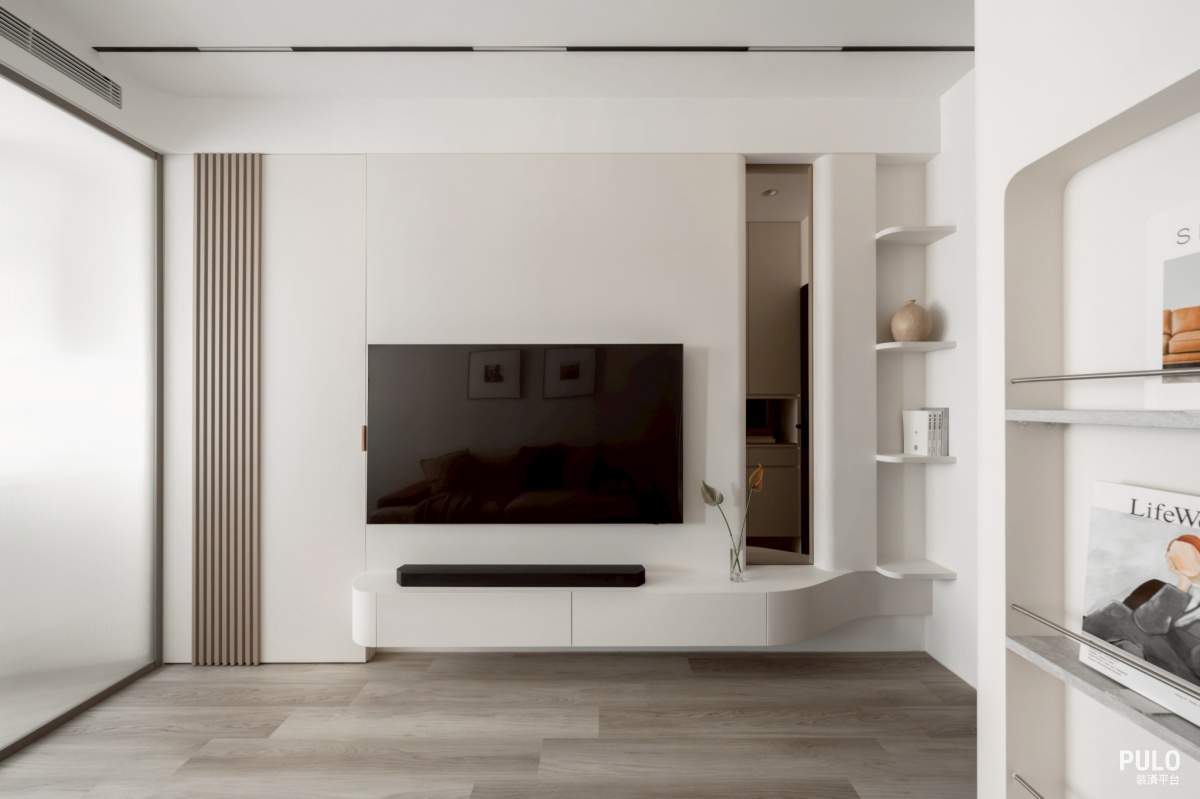 廚房區域設計了一個小中島,備餐空間變大之外,平常也能當作簡易的餐桌使用。 電視牆 電視牆的設計延續了奶油色的簡約感,最特別的是電視牆後方其實藏了一道通往主臥的「 隱藏門」。