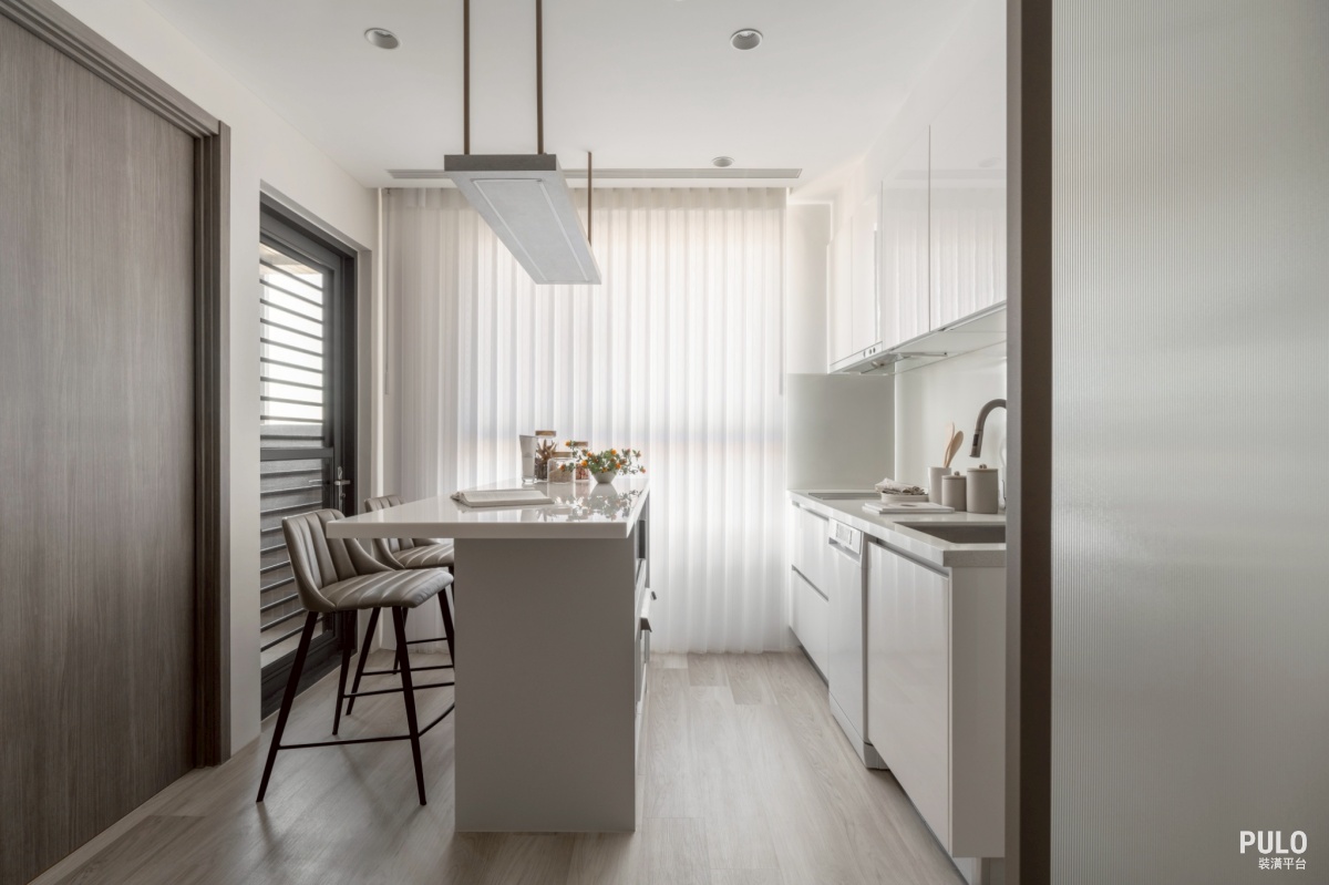廚房 原本大門打開會直接一眼望穿廚房,所以設計上用了一道長虹玻璃屏風來做區隔。長虹玻 璃的好處是透光不透視,既能擋住視線,又不會讓玄關、客廳覺得太暗。