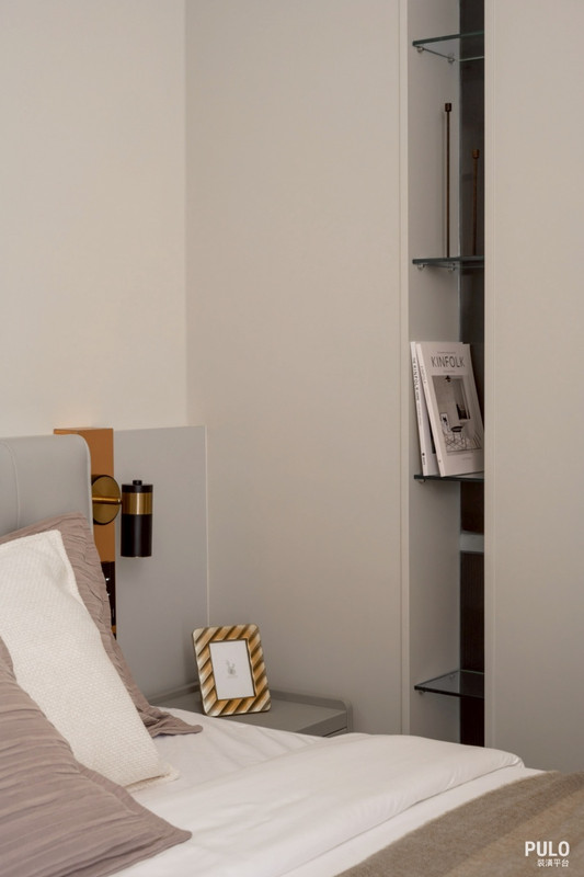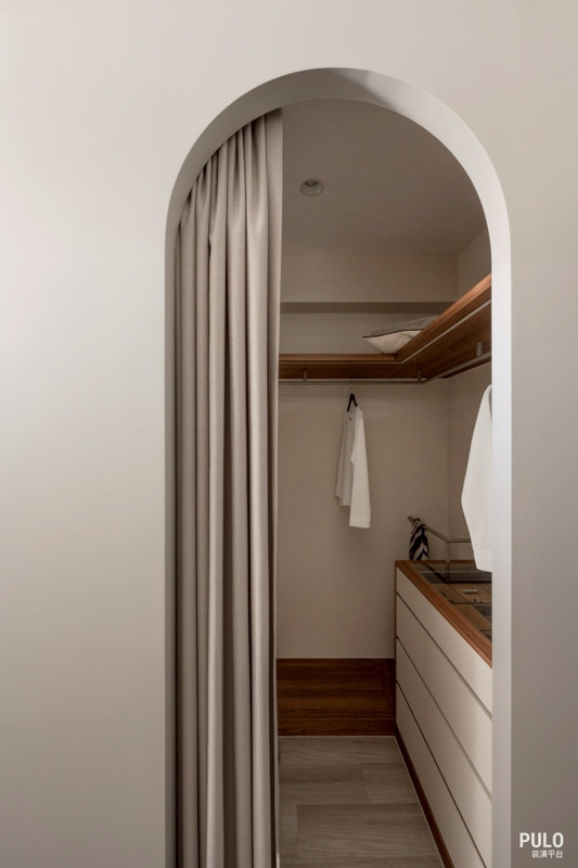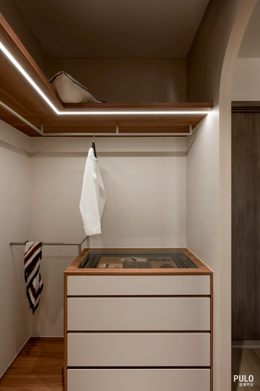 關起來的時候牆面看起來很完整,視覺上會覺得客廳比較大,不會被門框切斷線條。 主臥 雖然坪數不大,但主臥裡面還是規劃了一個小小的更衣間,讓衣服收納可以集中,不會散 落在房間各處。