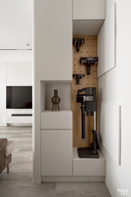 櫃子另一邊也有收納功能,吸塵器這種長型家電就有地方擺放,對小宅來說超重要。
