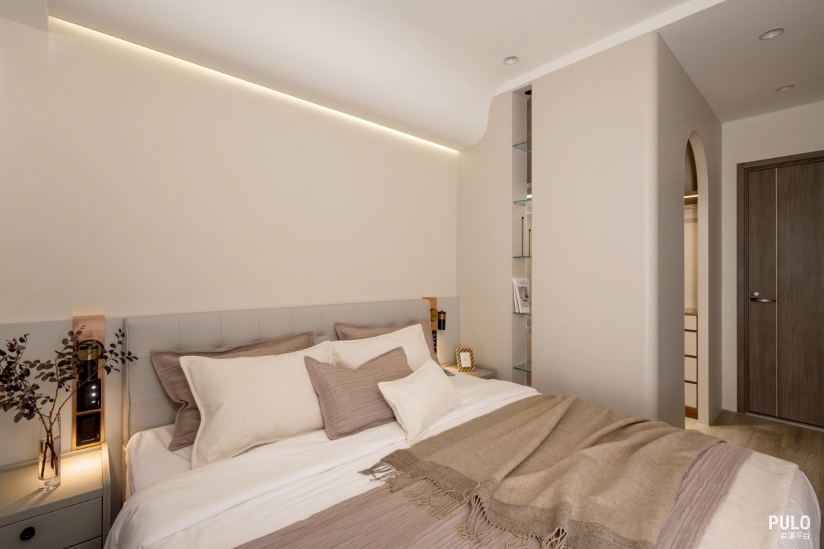 另外,床頭上方原本有樑柱壓迫的問題,這邊用了圓弧造型來修飾大樑,並在弧線的地方 加上燈條。