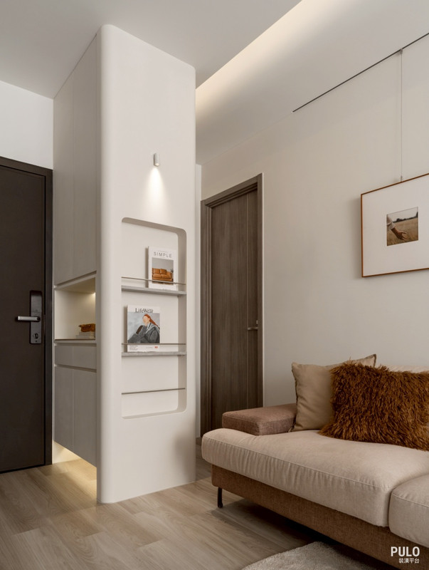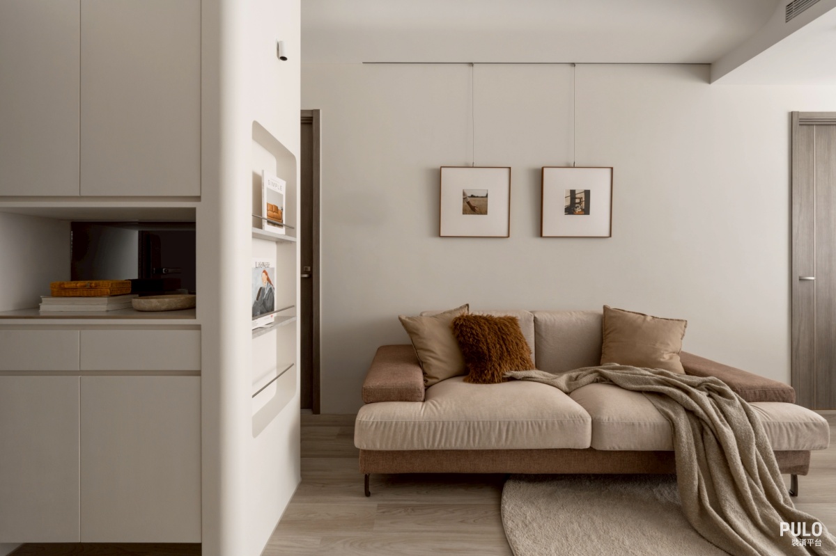 客廳 小坪數最怕的就是一開門看光光,或是風水上說的「穿堂煞」。原本一進門左邊就會看到 房間,這邊直接做了一個收納櫃,剛好隔出玄關區。