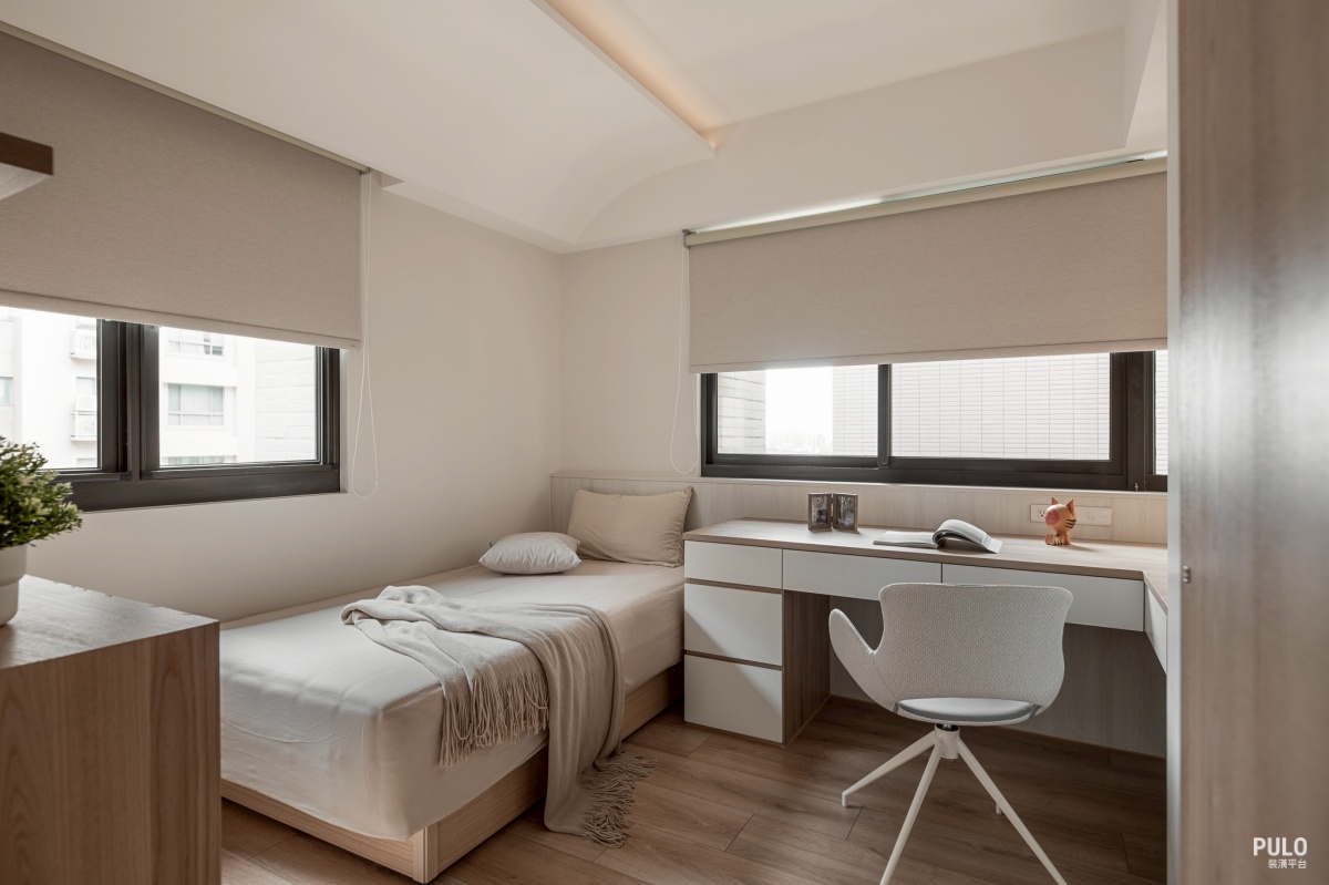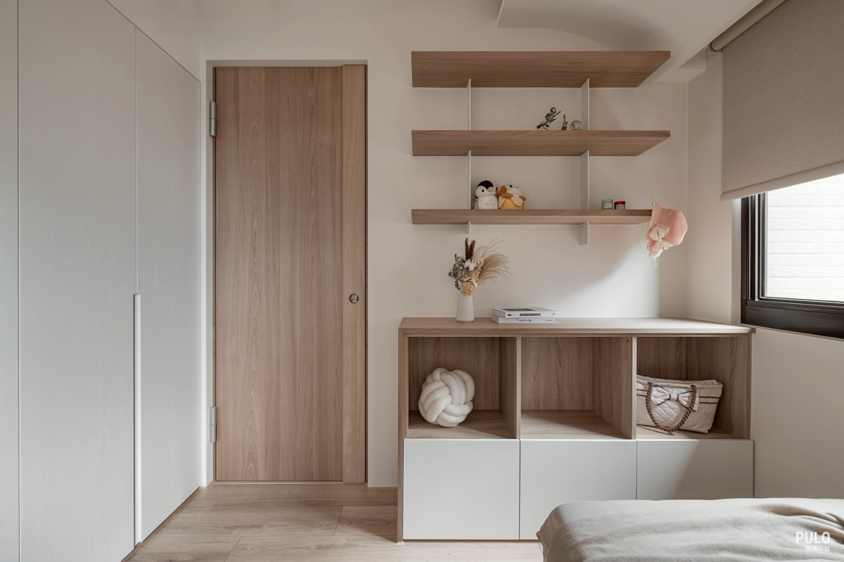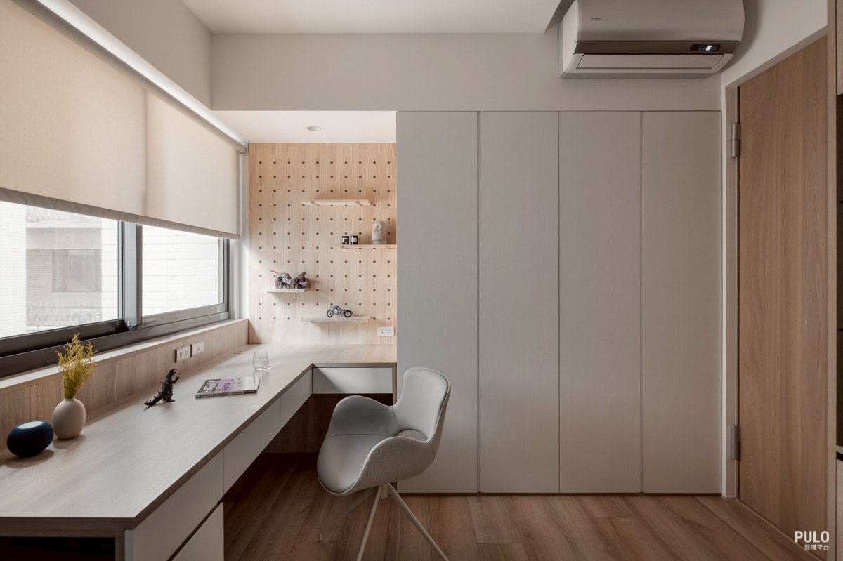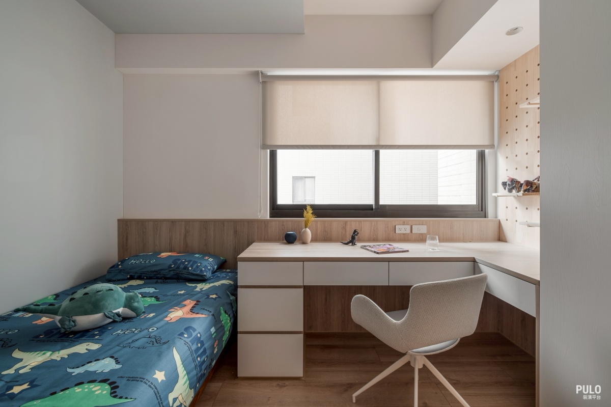 其他臥室則同樣以木質風格為基底,窗邊規劃了長型的書桌檯面,旁邊的洞洞板不僅能隨 手掛上包包小物,也讓孩子能展示自己的收藏。