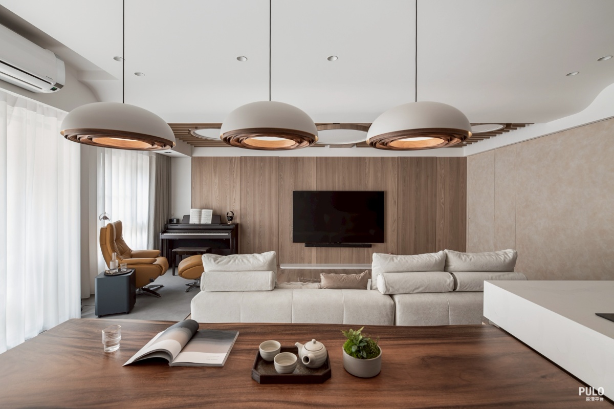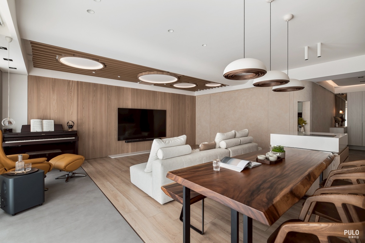 為了讓空間有不同的層次,燈具上特別加裝電視牆上方的燈條,提供了柔和的環境光,餐 桌上方的圓盤吊燈則補足了需要的亮度,同時也是客廳與餐廳之間的一個視覺重點。