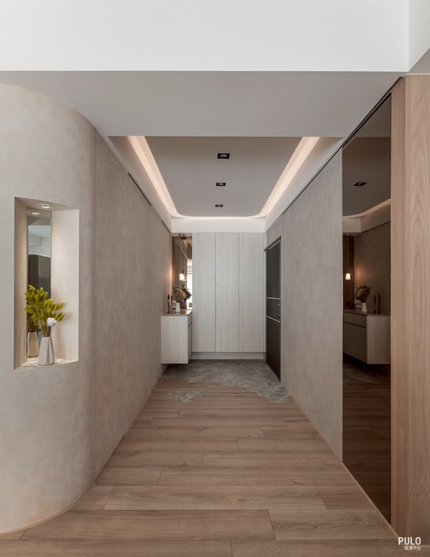 玄關 一進玄關,最先注意到的是地面的細節。設計師利用六角磚與超耐磨木地板做拼接,地面 完全沒有傳統的門檻條。