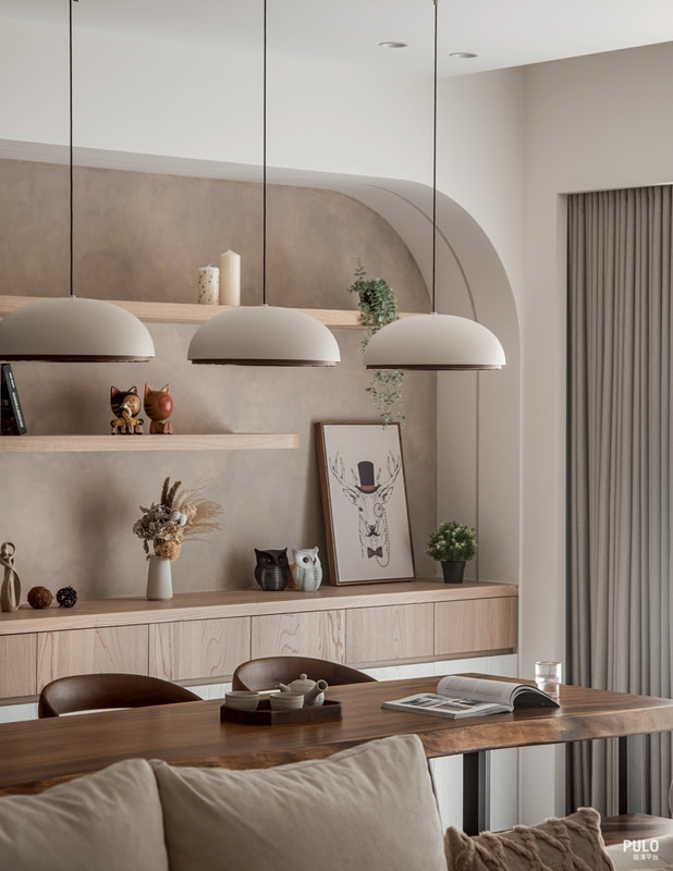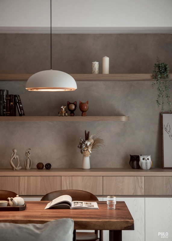 有趣的是,可以發現牆面上幾乎找不到任何燈具開關,因為整合了智能家居系統,所有燈 光與環境控制都收進感應器中,牆面因此少了很多開關面板,視覺上變得更乾淨。 沙發後方擺放了一張厚實的實木餐桌,作為一家人的核心。